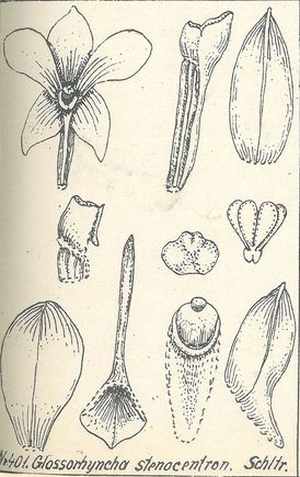 References W3 Tropicos, Kew Monocot list , IPNI ; *The Orchidaceae of German New Guinea Schlechter 1912 drawing fide; Die Orchideen 3 Auflage Bd 1 Sonderabdruck aus Schlechter Lieferung 6 321 - 384 Brieger, Maatsch and Senghas 1975 as Glossorhyncha stenocentrum drawing fide