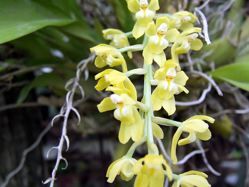 Found in Brazil, Argentina and Paraguay in moist forests at elevations of 100 to 320 meters as a small sized, warm to cool growing epiphyte with closely set, erect, straight or curved, laterally strongly compressed, ancipitous, longitudinally shallow grooved with age pseudobulbs partially enveloped by 2 to 3, leafless or leaf bearing sheaths and carrying two, apical, leathery, erect to spreading, narrowly lanceolate, acute, tapers and then narrows into the conduplicate, petiolate base leaves that blooms in the late spring and summer on a gracefully arching, 6" to 10" [15 to 25 cm] long, many densely flowered, inflorescence arising on a newly matured pseudobulb and carrying very fragrant flowers .