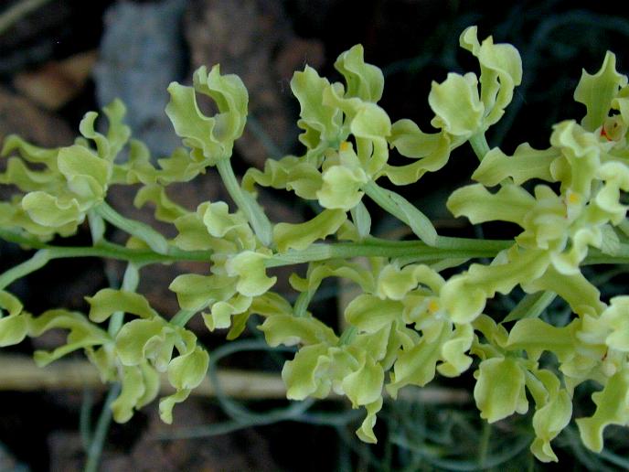 Found in Espirito Santo, Rio de Janiero, Minas Gerais, Sao Paulo, Parana, Santa Catarina and Rio Grande Do Sul states of Brazil, Paraguay and northeastern Argentina in cool mountains at elevations of 50 to 1400 meters as a medium sized, cool growing epiphyte or terrestrial with narrowly ovoid, ancipitous, compressed pseudobulbs carrying 2, erect, coriaceous, linear-oblanceolate, acute, longly conduplicate below leaves that blooms in the fall and winter on an arcuate, axillary, nodding, 4 to 13" [10 to 35 cm] long, densly many flowered inflorescence with small, fragrant flowers.