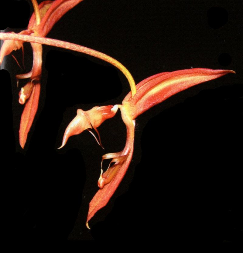 Found in Para state of Brazil in riparian forests at elevations around 200 meters as a medium sized, hot growing epiphyte with aggregate, ovoid, longitudinally sulcate pseudobulbs partially enveloped by evanescent sheaths and carrying 2, apical, elliptic-lanceolate, acuminate, attenuate below into the petiolate base leaves that blooms in the winter on a pendent, 82.8" [207 cm] long, to 60 flowered inflorescence carrying non-resupinate, .