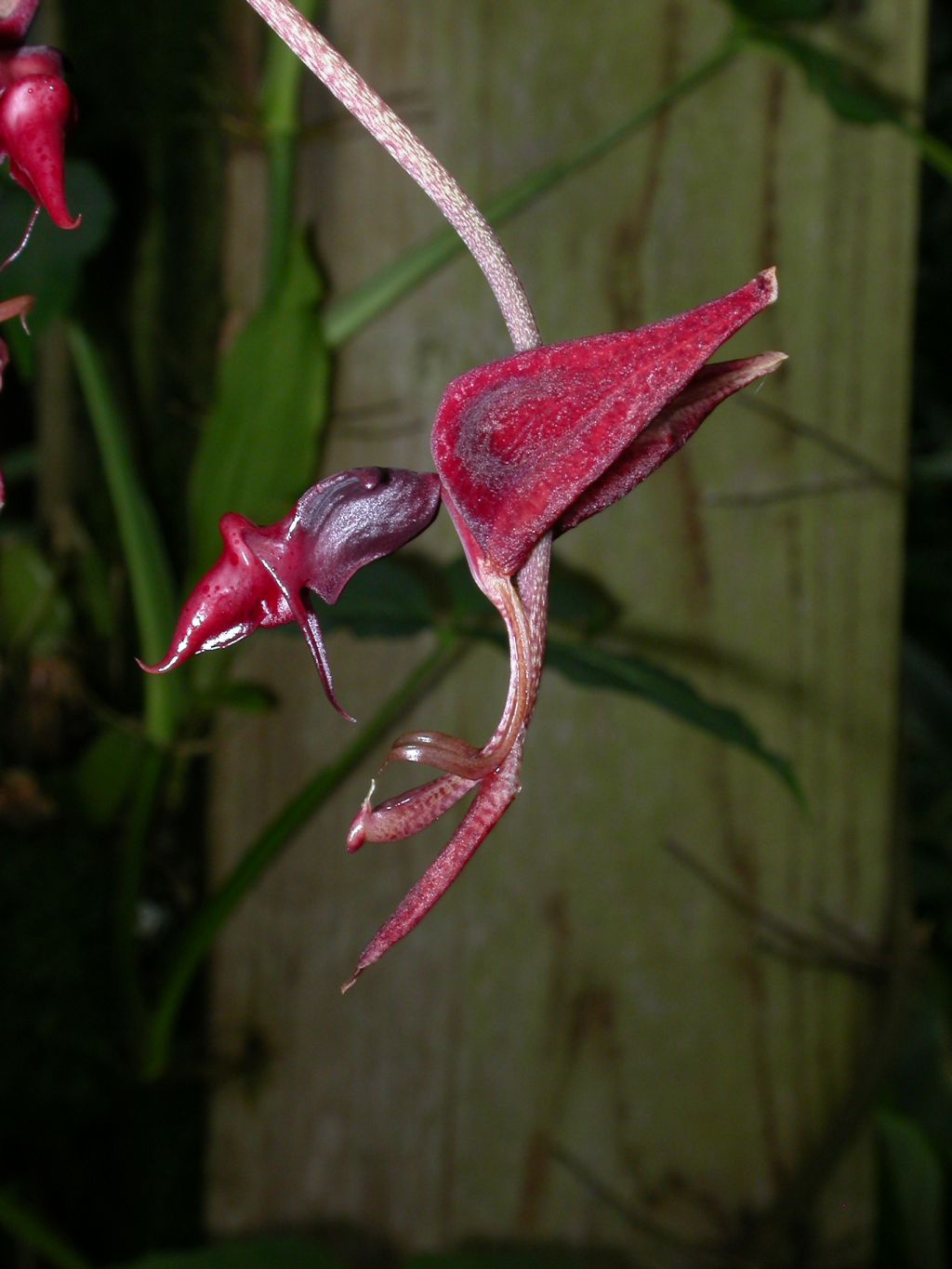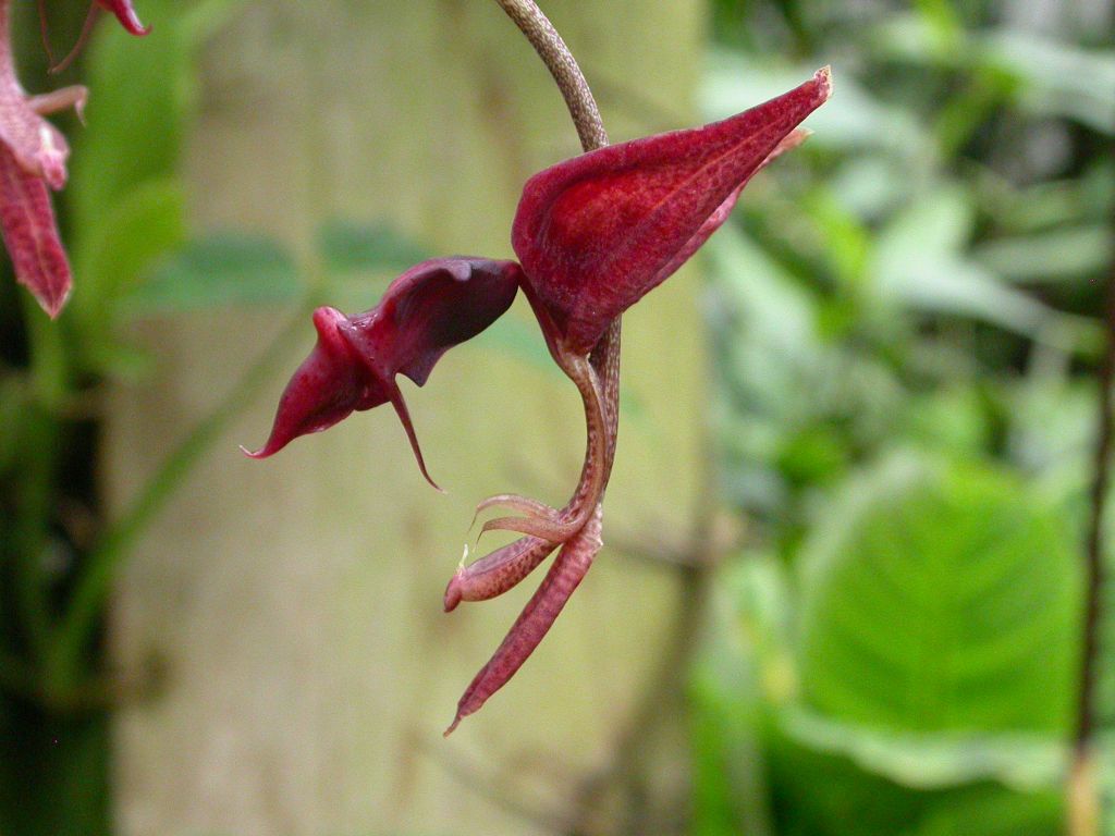 Found in Ecuador in wet premontane forests at elevations of 100 to 800 meters as a medium sized, hot to warm growing epiphyte with swollen, longitudinally ribbed pseudobulbs carrying 2 apical, broad, thin plicate leaves that blooms in the late spring in northern hemisphere culture on a basal, pendant, 6 to 10 flowered inflorescence.