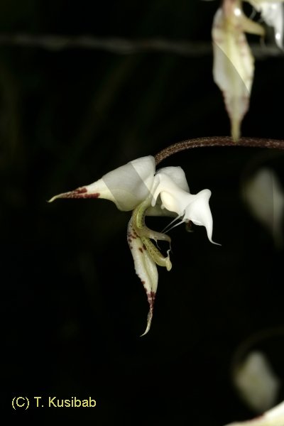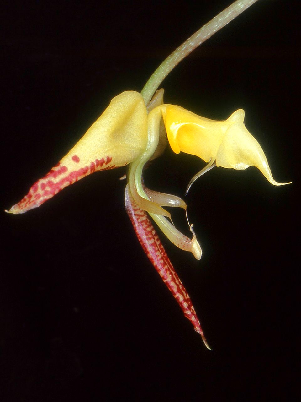 Found in Colombia in mangrove marshes and estuaries at elevations near sea level as a medium sized, hot growing epiphyte with ovoid, ribbed pseudobulbs carrying 2, apical, erect, plicate, elliptic to elliptic-lanceolate, acute leaves that blooms on a basal, pendent, 24" [60 cm] long, several to many flowered inflorescence.