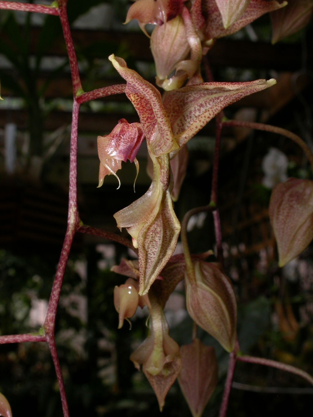 Found in Colombia, Ecuador and Peru in wet montane, primary forests at elevations of 700 to 1400 meters as a medium sized, hot to cool growing, caespitose epiphyte with ovoid to ovoid-pyriform, sulcate, obtuse or acutely angled pseudobulbs with 2 apical, elliptic-lanceolate, acute, ribbed, leaves with a channeled petiole that blooms in the summer on a 14 to 20" [35 to 50 cm] long, pendant raceme with several to many [18 to 39], simultaneously opening flowers arising on a mature pseudobulb.