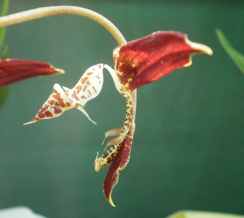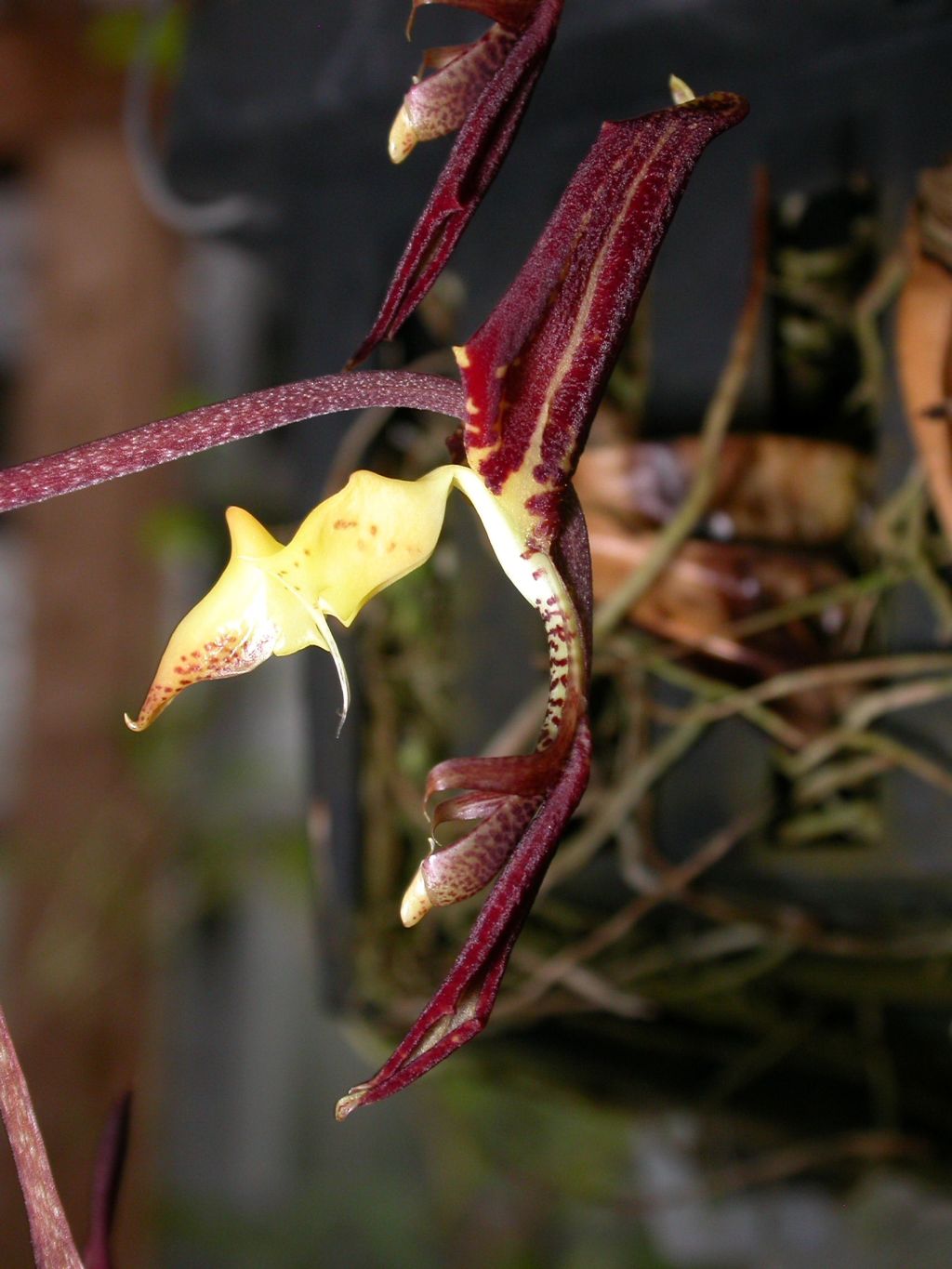 Found in Venezuela and Tolima, Colombia as a medium sized, hot growing epiphyte that blooms in the spring on a basal, pendent, many flowered inflorescence.