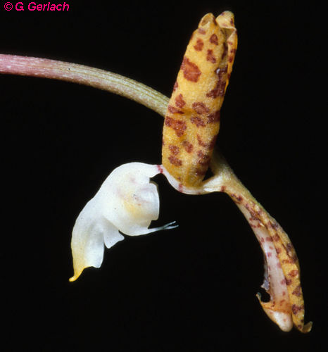 Found in Panama, Colombia and Peru? as a hot to warm growing epiphyte with ovoid, angular pseduobulbs carrying 2 apical, plicate, 3 nerved, subcoriaceous, elliptic-lanceolate, subacute, attenuate below into the base leaves that blooms in the winter and spring on a pendant, gracile, glabrous, 14" to 18" [35 to 45 cm] long, laxly many flowered inflorescence with oblong-lanceolate, acute floral bracts and carries fragrant flowers that are the smallest in the genus.