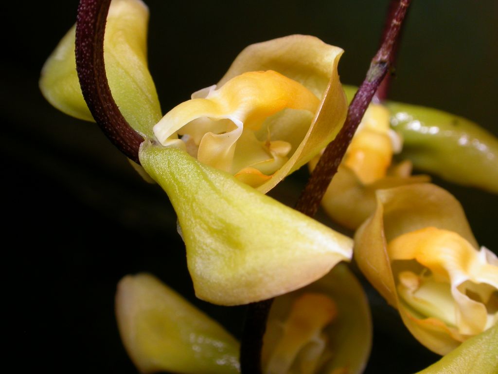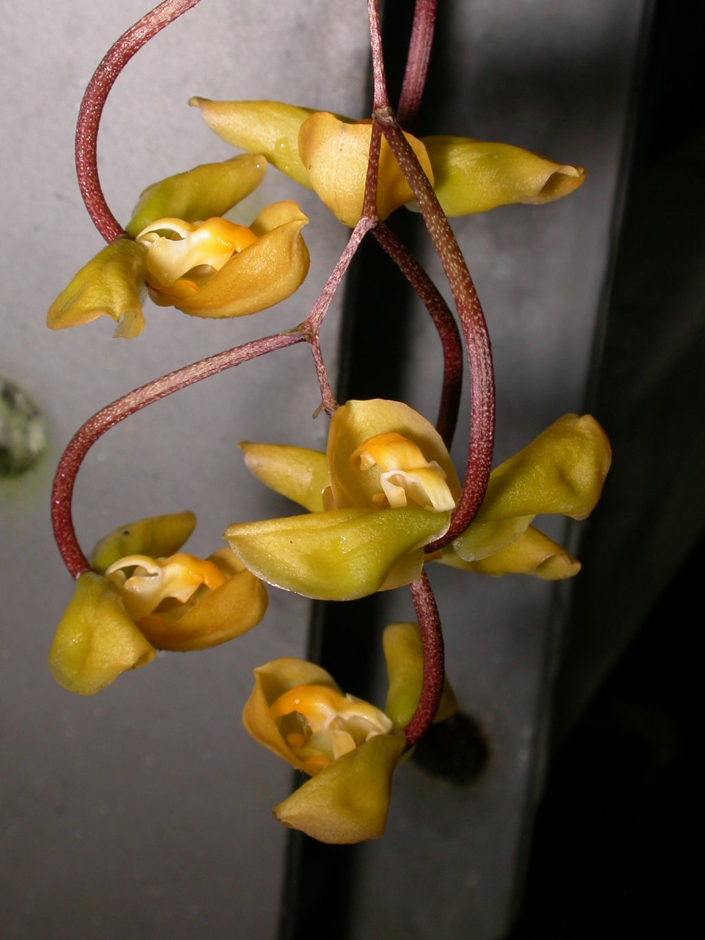 Found in Chiapas atate of Mexico and Guatemala in the Sierra Madre de Chiapas in secondary vegetation of wet montaine rainforest at elevations of 1100 to 1300 meters as a medium sized, coolgrowing epiphyte with ovoid, sulcate, somewhat compressed pseudobulbs carrying 2, apical, arching, plicate, oblanceolate or narrowly elliptic, acuminate, 3 nerved, longly attenuate into the channeled petiolate base leaf that blooms in the late summer on a basal, 1 to 2 per mature pseudobulb, racemose, 4 to 6 simultaneously flowered, 6" [15 cm] long, erect then pendant inflorescence arising with a new growth with a fractiflex rachis with lanceolate, acuminate, close, scarious floral bracts and carrying very fragrant non-resupinate flowers.