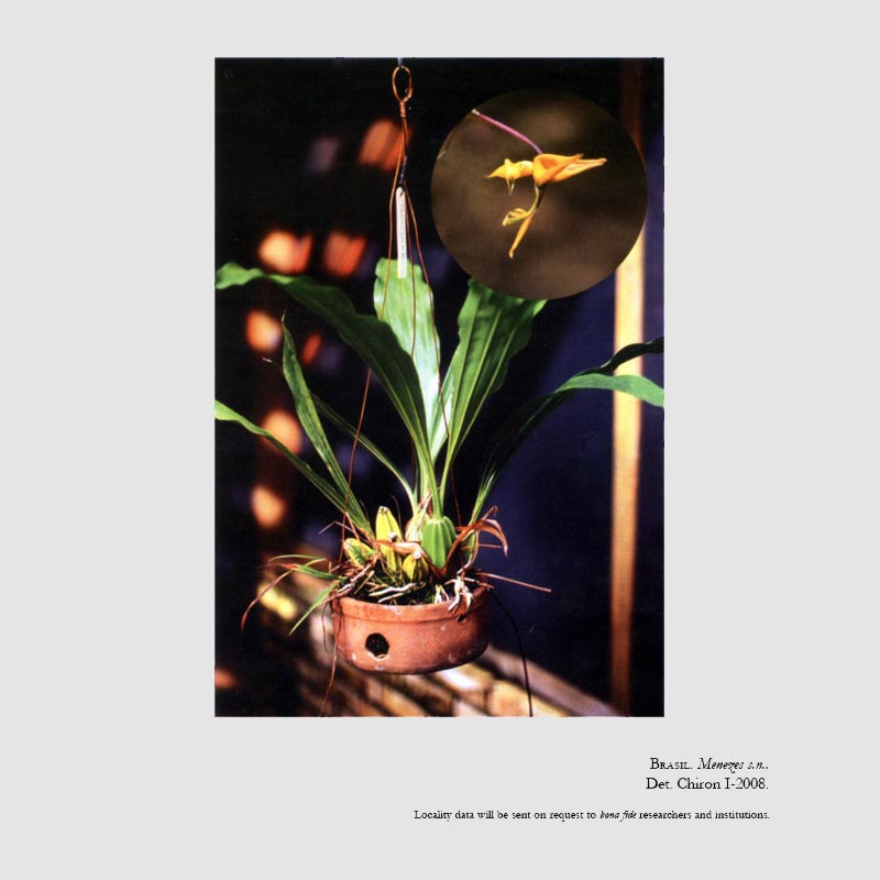 Found in Pernambuco Brazil at elevations around 300 meters as a medium sized, hot growing epiphyte with ovoid, strongly angled, six sided pseudobulbs enveloped basally by 2 papery bracts and carrying 2, apical, erect, plicate, elliptic, undulate margined, apiculate, gradually narrowing below into the canaliculate, petiolate base leaves that blooms in the later summer and earlier fall on a basal, pendent, several flowered inflorescence