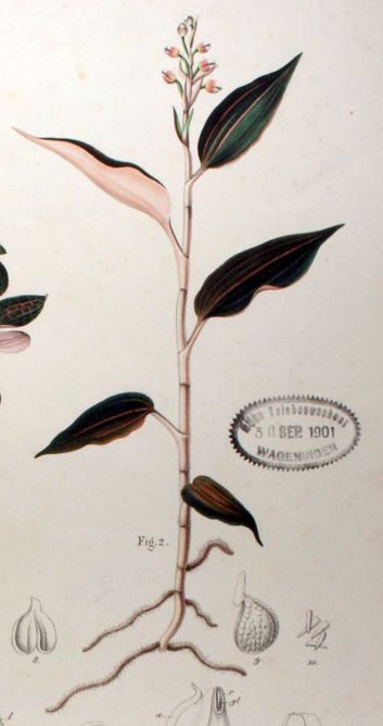 Found in Malaysia, Sumatra, Java and Borneo in lower montane forests at around 700 to 1500 meters as a miniature sized, warm to cool growing terrestrial orchid with a fleshy, light red stem carrying 4 to 6, well spaced, lanceolate to ovate, acute, dark red, with 3 to 5 broad light yellow to pink veins, often with more narrower ones, gradually narrowing below into the petiolate base leaves that blooms in the fall on a terminal, 2 to 3.2" [5 to 8 cm] long, to 10 flowered inflorescence with 3 large, leafy sheaths and longer than the pedicel and ovary floral bracts.