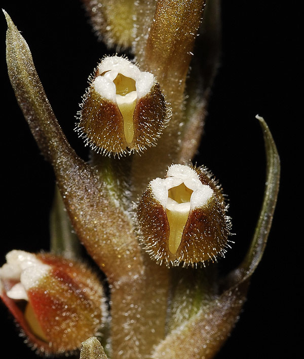 Found as a miniature to small sized, hot to cool growing terrestrial, lithophyte or epiphyte in rock crevasses in Assam, Eastern Himalayas, India, Bhutan, Thailand, Malaysia and Vietnam in lowland, broadleaf evergreen forests at elevations of 150 to 2200 meters in deep shade and high humidity with 6 to 8 basal, subsessile, ovate-lanceolate, acuminate leaves and blooms in the spring and summer on an erect, 4" [10 cm] long, spicate, hispidly glandular, twisted above inflorescence with bracts that are shorter than the many small, white flowers.