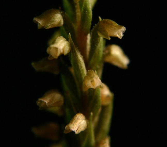 Found in Mexico, Guatemala, El Salvador, Honduras, Nicaragua and Dominican Republic? on steep slopes in cloud forests at elevations of 1350 to 1500 meters as a medium sized, cool growing terrestrial with a thick, glabrous, leafy stem carrying several, dark green, carinate, velvety, narrowly elliptic, acute, gradually narrowing below into the petiolate base leaves with a longitudinal white stripe that blooms in the fall on an erect, thin, densely pubescent, 7" [17.5 cm] long, narrowly cylindric, to 20 flowered inflorescence with 5 tightly fitting, acuminate bracts and lanceolate, acuminate, pubescent floral bracts.