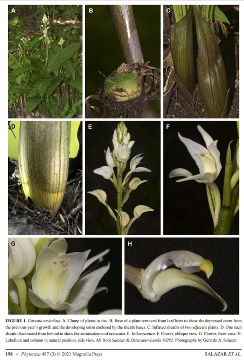 "Govenia utriculata is distinguished by the inflated bladeless leaf sheaths, the uppermost of which completely encloses the leaf petioles and, in living condition, is circular in cross section and partially filled with rainwater" Salazar etal 2021