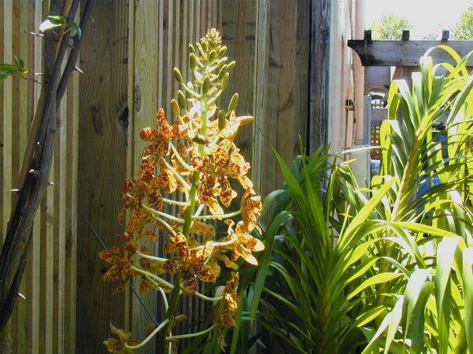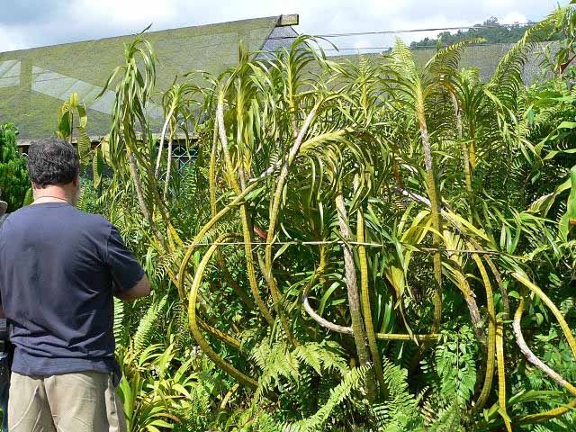 A large to giant sized, hot to warm growing epiphyte and occasional lithophyte occuring in lowland forests near streams and rivers at elevations of 100 to 1200 meters in Myanmar, Thailand, Laos, Vietnam, Malaysia, Borneo, Java, Moluccas, the Philippines, Sulawesi, Sumatra, Bismark Islands, Papua and New Guinea and the Solomon Islands and is recorded to be the heaviest orchid in the world and is capable of becoming huge in cultivation. They have erect to spreading, very long, cylindric, yellowish with age, many ridged and noded pseudobulbs enveloped completely by leafless and leaf-bearing sheaths and carrying thin textured, distichous, linear or ovate, obtuse or acute, decurved in apical half leaves that are articulated to the basal leaf sheaths and blooms in the summer, fall and early winter as well as in the summer and have a 4 to 10 foot [120 to 300 cm] long, basal, erect to arching, racemose, many flowered inflorescence that carry 30 to 50 sometimes fragrant, waxy, successively opening, long-lasting flowers with the lowest flowers being imperfect and distant. This species has erect,spreading or drooping pseudobulbs that can be up to 3 meters long and leaves that go well up the stem giving them more of a palm tree look. Can be slow to bloom, plants need to be large and have a lot of backbulbs and even still the orchid can be sporadic, at best, to bloom. This species is often found in conjunction with ants and may benefit from their presence.