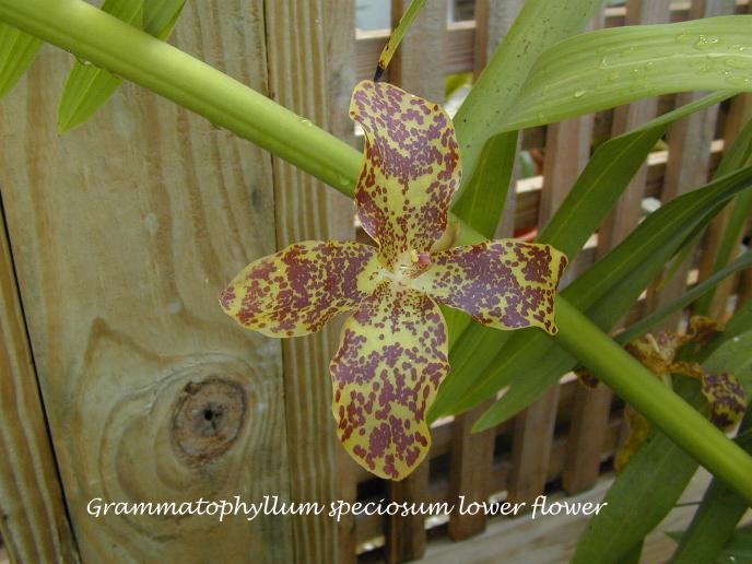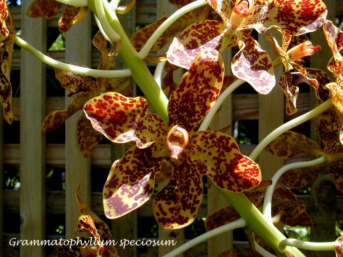 Synonyms Grammatophyllum cominsii Rolfe 1891; Grammatophyllum fastuosum Lindl. & Paxton 1851; Grammatophyllum giganteum Blume ex Rchb. f. 1877; Grammatophyllum macranthum Rchb. f. 1862; Grammatophyllum pantherinum Rchb.f 1878; Grammatophyllum papuanum J.J. Sm. 1911; Grammatophyllum sanderianum hort. 1893; Grammatophyllum wallisii Rchb. f. 1877; Pattonia macrantha Wight 1852