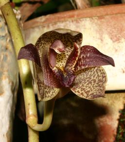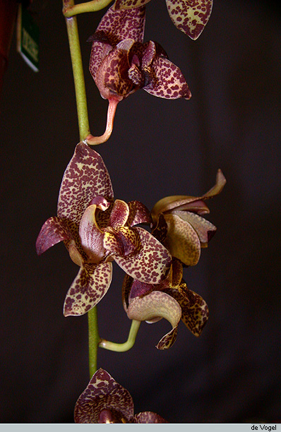 A medium sized, epiphytic, warm to hot growing species from Malaysia, Sumatra, Java, Celebes and the Philippines in rainforests on larger tree trunks at elevations of 200 to 1000 meters with ovoid, laterally compressed, clustered pseudobulbs carrying 2 to 3, leathery leaves and blooms in the later spring and summer on a basal, pendulous, 1 1/2' [45 cm] long, several to many [to 10] flowered, racemose inflorescence with waxy, long-lasting, foul smelling flowers.