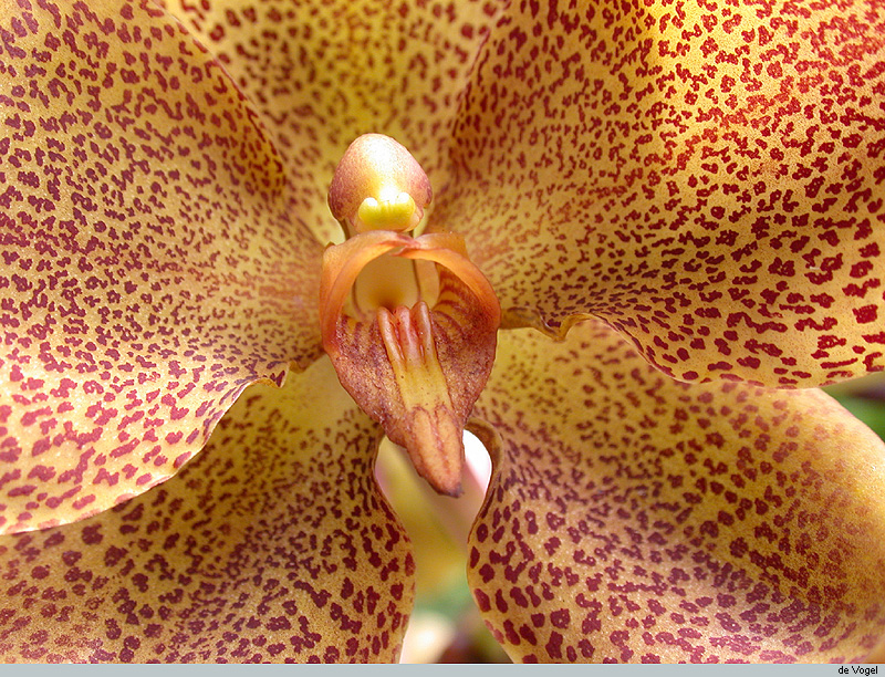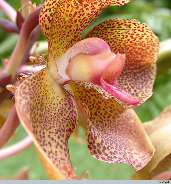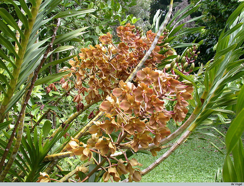 Found in New Guinea in lowland forests at elevations of sea level to 1200 meters as a giant sized, hot to warm growing epiphyte with stout, elongated, densely leaf stems with many internodes and carrying strap-shaped, acute, midrib prominent below, coriaceous leaves that blooms in the spring and fall on a basal, stout, many flowered, to 6' 8" [2 meters] long inflorescence with triangular, obtuse, concave floral bracts and large, fleshy, fragrant flowers.