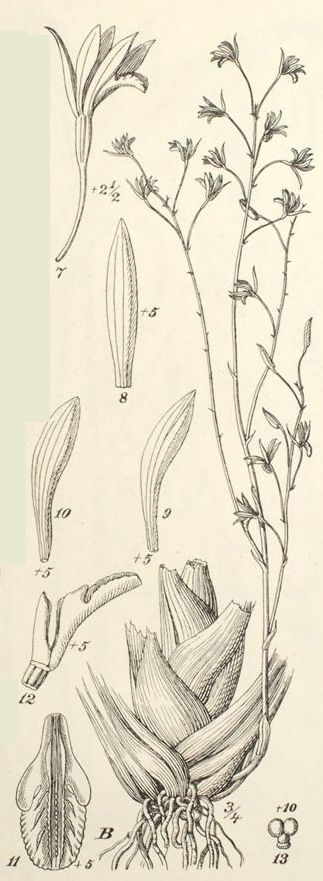 Found in northwestern Madagascar on savannahs at elevations up to 300 meters as a small sized, hot growing epiphyte with clustered, ovoid-oblong pseudobulbs carrying after flowering, very narrow, grass like, very acute leaves that blooms in the summer on an erect, to 10" [25 cm] long, slender, peduncle short, provided with 2 to 3 small sheaths paniculate, 3 to 5 branched, loosely many flowered inflorescence with small, acute, much shorter than the pedicel floral bract.
