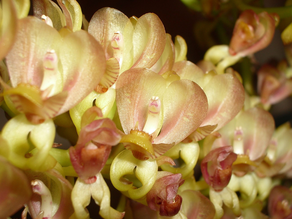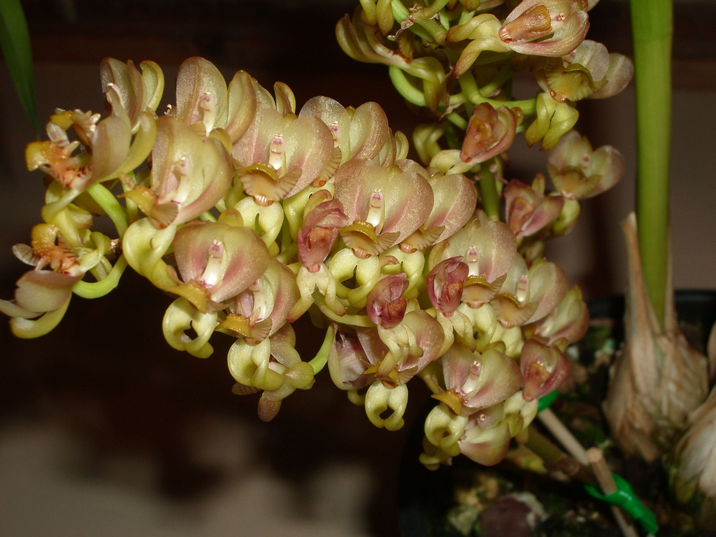 Found in Brazil as a small to medium sized epiphyte with round-ovoid pseudobulbs carrying narrowly linear leaves that blooms in the later winter through spring on a to 8" [20 cm] long, densely several flowered inflorescence