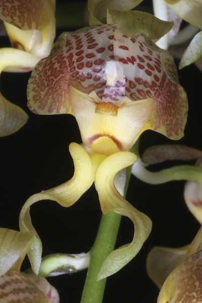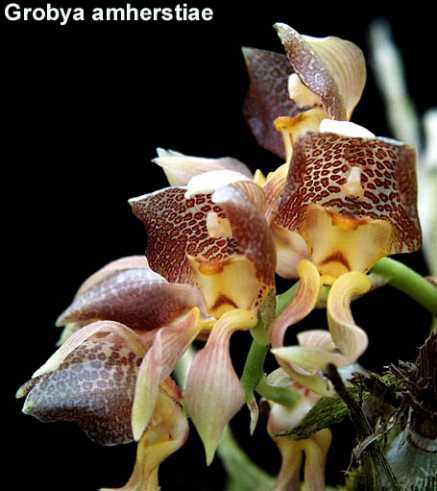 A small sized, hot to warm growing epiphyte that is found in Ecuador and eastern Brazil in lowland, wet forests at elevations of 200 to 900 meters that requires moderate shade and has densly tufted, erect, ovoid to almost spherical pseudobulbs enveloped basally by persistent, white, fibrous leaf bases and carries up to 6, towards the apex, firm-textured, erect and arching, linear-lanceolate, subacute, slightly grooved leaves and blooms with a basal, 1 to several [9] flowered, arching to pendant, 6" [15 cm] long, racemose inflorescence arising on a mature pseudobulb with fragrant flowers and narrowly lanceolate bracts.