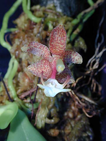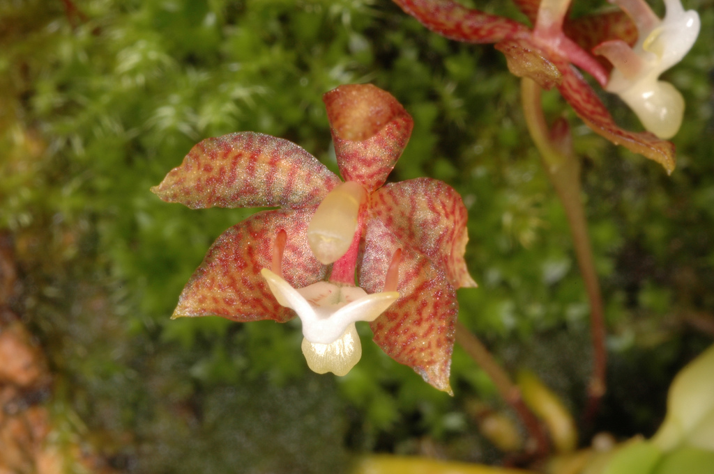 Found in Myanmar, Thailand, Hainan province of China, Vietnam, penninsular Malaysia, Andaman Islands, Java, Sumatra and the Philippines often in primary or secondary riverine, lowland and hill forests on twigs at elevations of 50 to 1200 meters as a miniature sized, hot to cool growing epiphyte with a very short stem carrying 5 to 8, two ranked, narrowly lanceolate, fleshy, curved, apically and unequally bilobed leaves that blooms in the late spring and early summer on many, arising from the base, thin, terete, 1.6" [4 cm] long, successively single, few [5] flowered inflorescence with one very small bract and triangular, acute, concave, reddish brown floral bracts and carrying the short-lived [1 day] flowers facing in all directions.