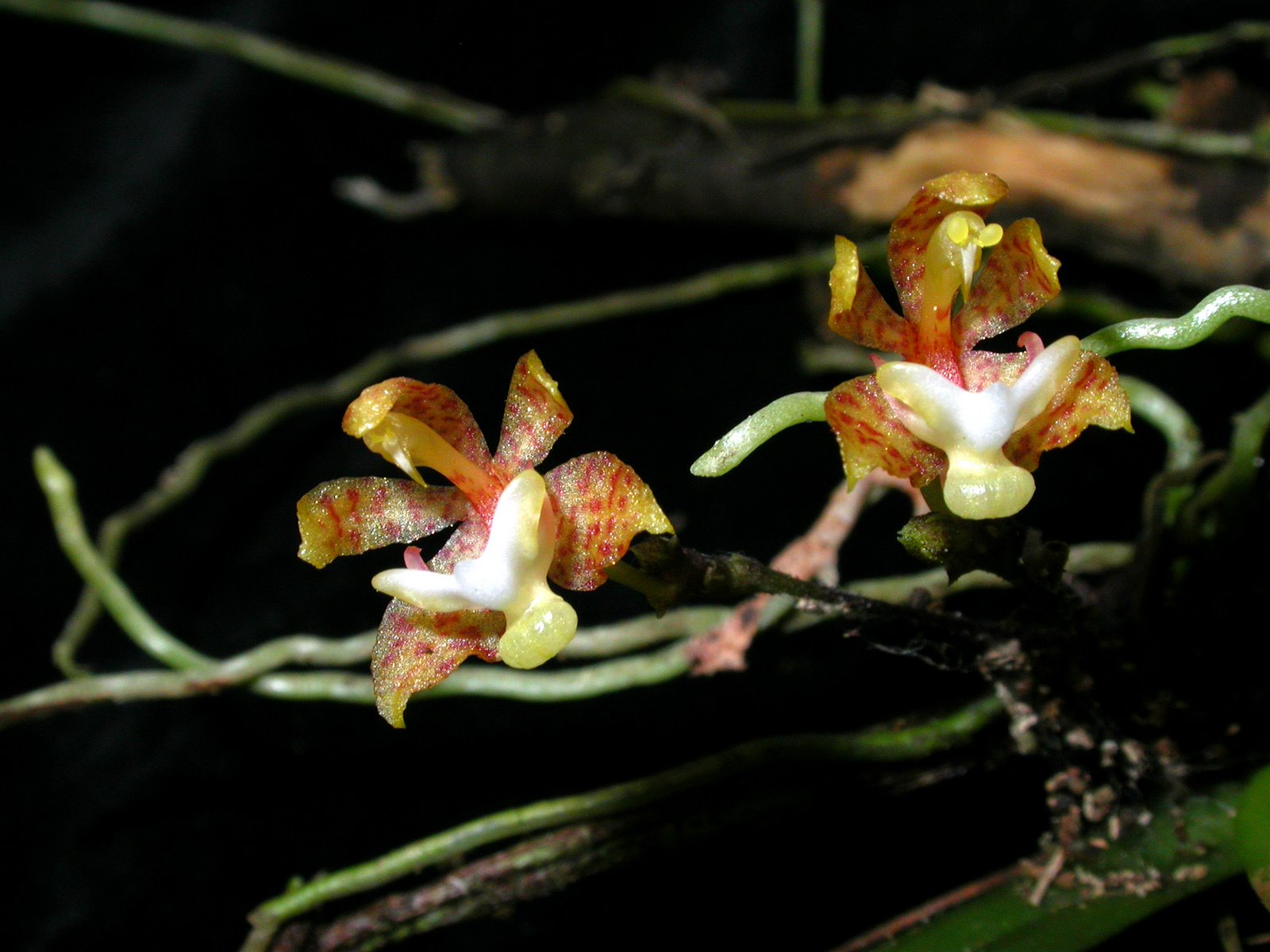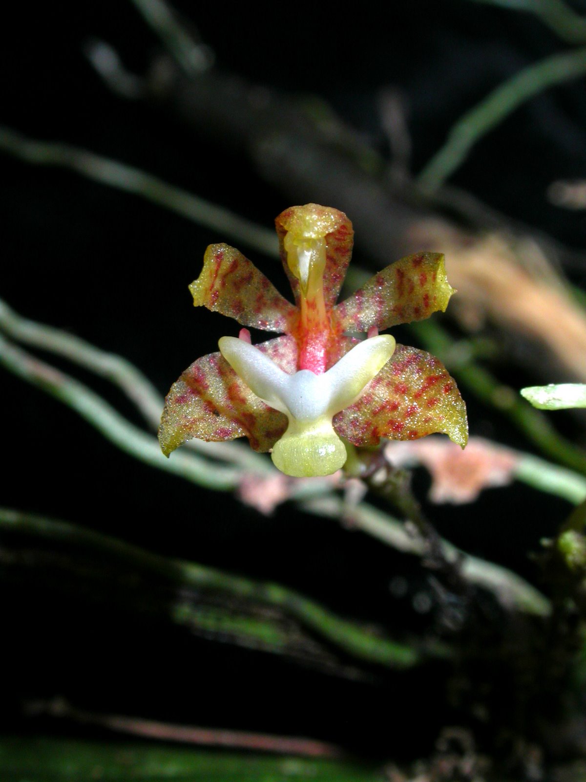 Found in Malaysia, Java and Sulawesi as a mini-miniature sized, hot growing, twig epiphyte with a short stem carrying a few leaves that blooms in the later summer and early fall on a 1.2" [3 cm] long, erect, successively few flowered inflorescence.