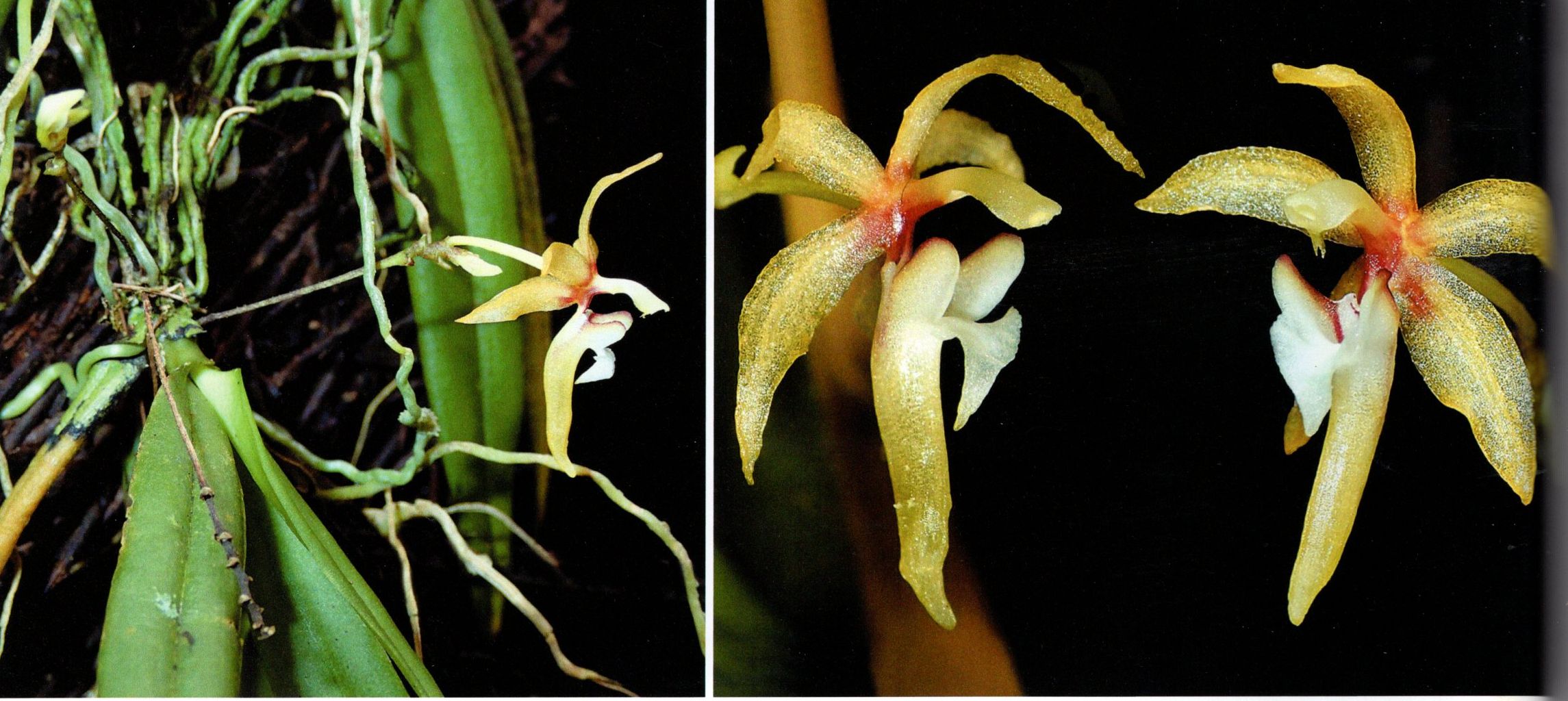 Found in Sabah Borneo in hill forests at elevations around 900 meters as a mini-miniature sized, warm growing epiphyte with a short, descending, slightly compressed stem carrying 3 to 5, in a descending fan, ligulate, often subfalcate, externally keeled, green, tapering towards an unequally bilobed apex, lobules narrow, acute, basally clasping leaves that blooms in the late fall and early winter on a lateral, from the stem below the leaves, spreading, peduncle .48 to .8" [1.2 to 2 cm] long, basally muriculate grey brown to maroon, graduating to green apically, provided with 2 to 3 enveloping basal scales, .96 to 1.32" [2.4 to 3.3 cm] long overall, rachis .12 to .4" [.3 to 1 cm] long, swollen, green with brown marks, verrucose, successively single, to 11 flowered inflorescence with spreading, patelliform, thick, obtuse, persistent, shorter than the ovary floral bracts and carrying ephemeral, odorless flowers.