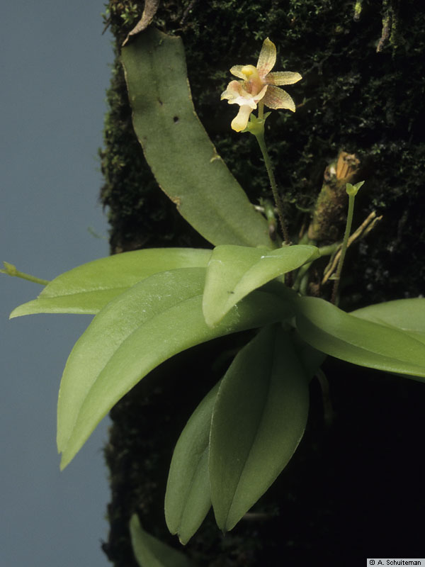 Found in Andaman Islands, Thailand, Malaysia and Sabah Borneo in lowland forests as a miniature sized, hot to warm growing epiphyte with a few, linear, acute, unequally bilobed apically leaves held in a loose fan that blooms on a 1/2 to 2" [1.5 to 5 cm] long, minutely hairy inflorescence with fleshy, acute, bracts and close set flowers.