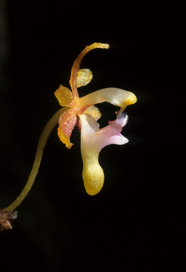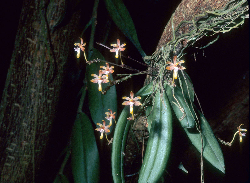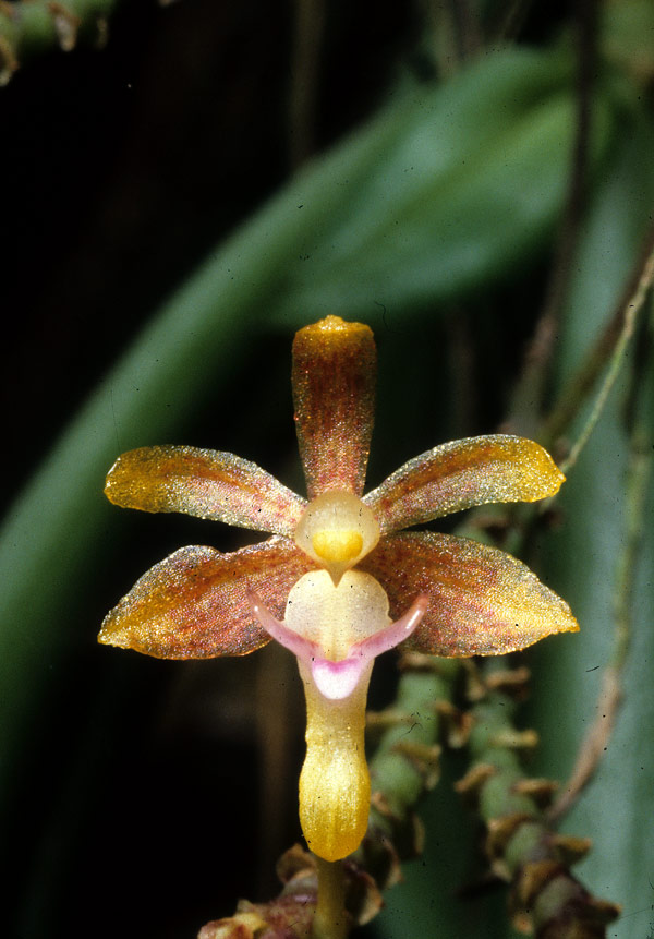 Found in Sabah Borneo in hill forests on limestone and sandstne substrates at elevtions of 400 to 700 meters as a mini-miniature sized, hot to warm growing epiphyte with a short, pedent stem enveloped completely by leaf bearing sheaths carrying narrowly elliptic, oblique, thinly coriaceous, pale green leaves that blooms in the spring and summer on 2 to 4, erect to porrect, peduncle .52 to 1.6" [1.3 to 4 cm] long, with a basal bract, rachis shortly setose hairy, yellowish green to green, turning purple with time, .12" [3 mm] long, successively 1 to occasionally 2, few flowered inflorescence with ovate, obtuse floral bracts.