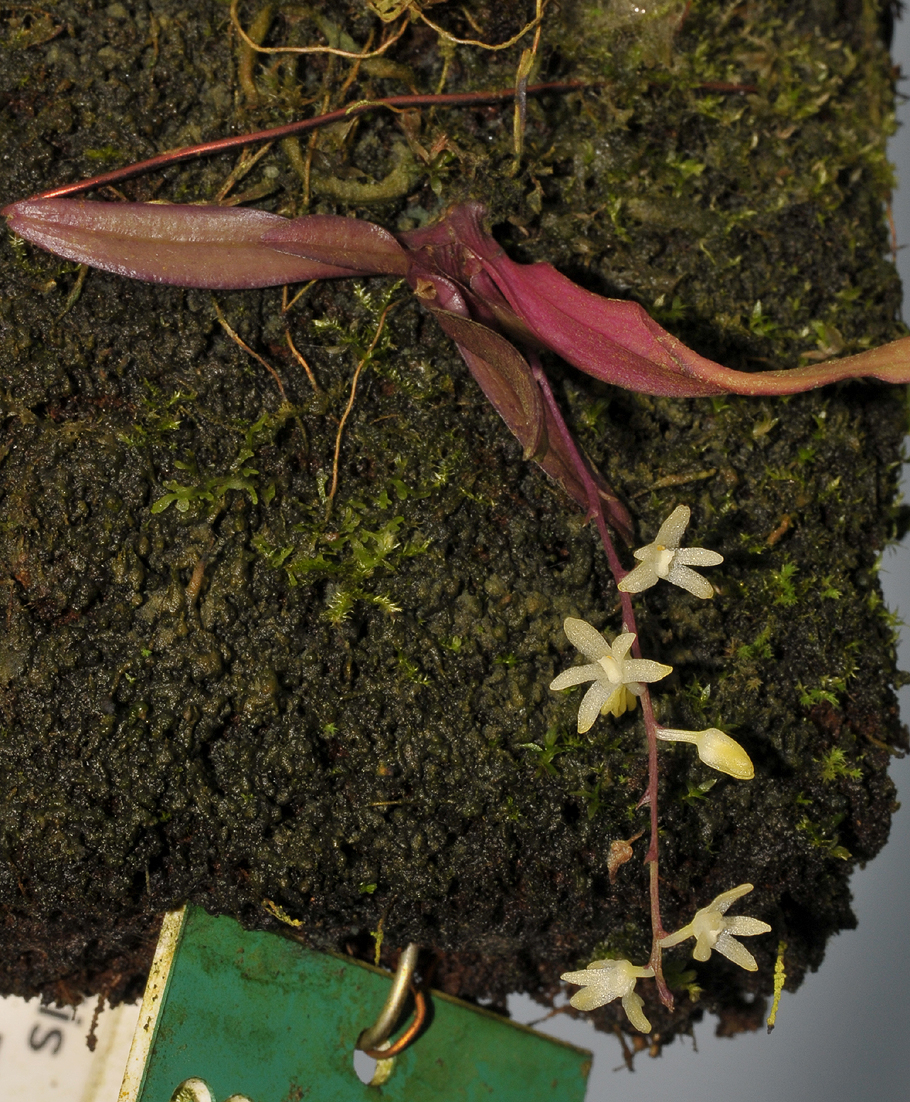A miniature sized, hot growing, monopodial epiphyte found in Papua and New Guinea, the Solomon Islands, New Caledonia and Vanuatu in riverine rainforests at elevations of sealevel to 200 meters in mangrove swamps, coastal forests, rainforests, and savannahs on twigs of trees in the uppermost part of the canopy in bright light with 4 to 8, erect, falcate-linear, oblique to subacute, bilobed apically leaves that blooms at any time of the year on a basal, 2 to 6" [5 to 15 cm] long, pendulous, fractiflex, many [25] flowered, racemose inflorescence with sporadic or simultaneously opening, delicate, fragrant flowers that last for only one day.