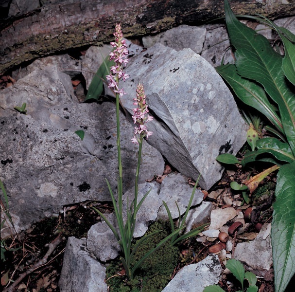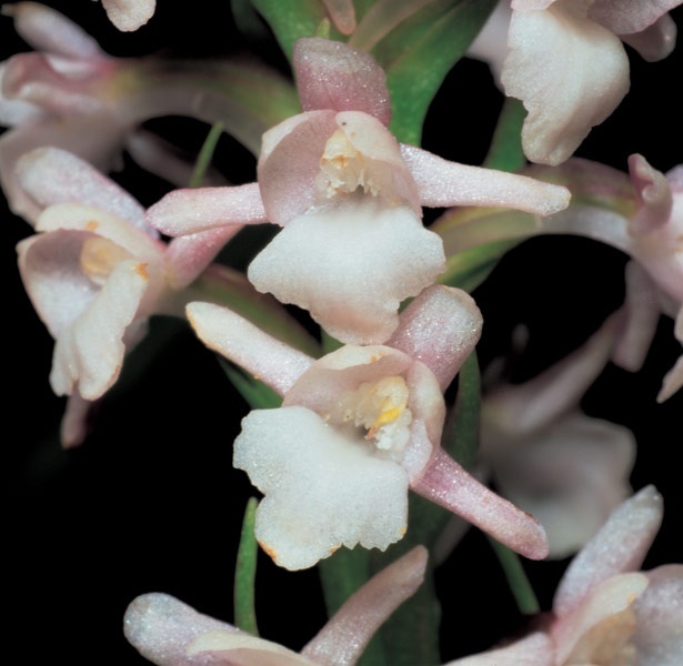 Found in Sweden, Spain, France, Belgium, Germany, Czechoslovakia, Austria, Hungary, Switzerland, Italy, Yugoslavia, Romania, Poland, Belarus, Ukraine and central Russia as a small to medium sized, cold growing terrestrial orchid that is similar to G conopsea except with a shorter stem and 4 to 6 leaves that blooms in the spring and summer on a cylyndrical, often flexuous, densly many flowered, bracteate, 9 to 15" [22.5 to 37.5 cm] long, racemose inflorescence with sweetly scented, color variable flowers.