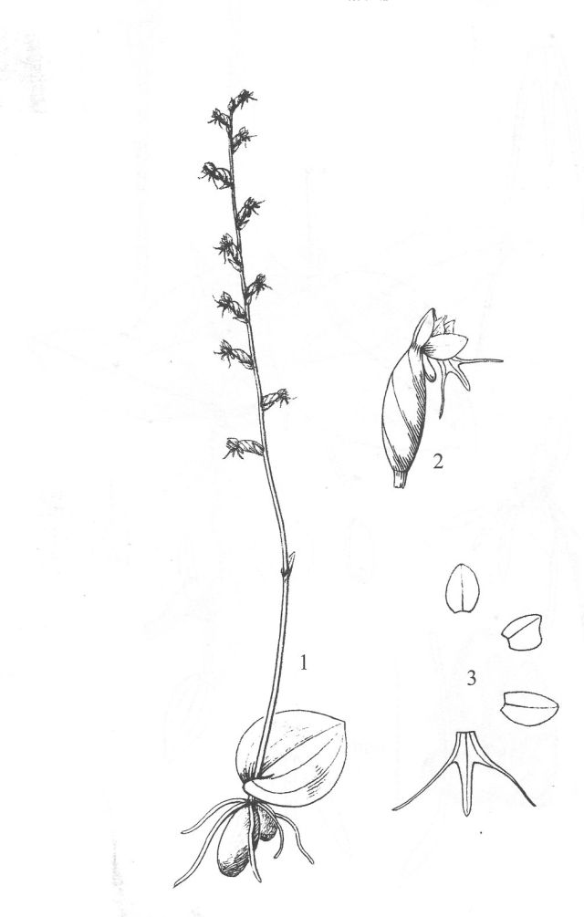 Found in east Qinghai, western Sichuan and southern Gansu provinces of China in forests and thickets at elevations of 900 to 1900 meters as a small sized, warm to cool growing terrestrial with ovoid, fleshy tubers giving rise to an erect to ascending, slender, glabrous stem with a basal leaf and 2 to 3 bract-like leaves above, carrying green to purplish red, ovate-orbucular, slightly fleshy, subcordate, mucronate apically leaves that blooms in the summer on a terminal, 7.2 to 8" [18 to 20 cm] long, rachis [8 to 12 cm] long, secund, 10 to 20 flowered inflorescence with ovate-lanceolate, much shorter than the ovary, acuminate floral bracts and carrying very small green flowers.