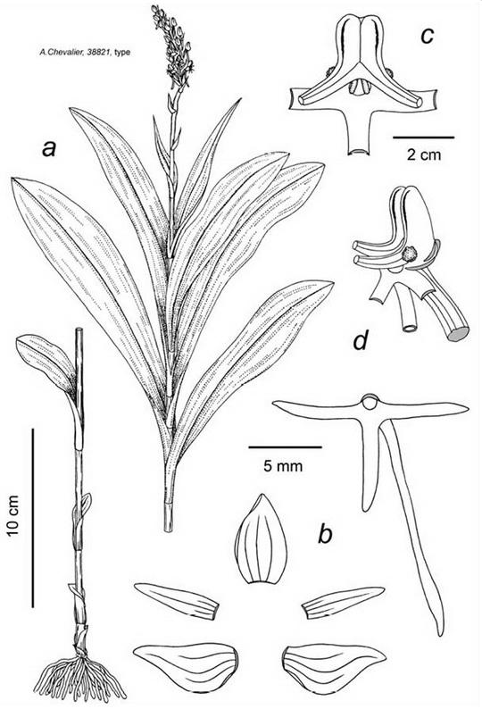 Found in southern Vietnam and is either quite rare or a questionable species known only from the type collection as a medium sized, warm to cool growing terrestrial with narrowly obovate leaves grading to bracts above that blooms on a terminal, erect, 2.4" [6 cm] long, densely several to many flowered infloresecnce with acuminate floral bracts .