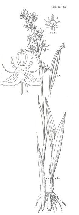 Found in Rio Grande do Sul state of Brazil and Uruguay as a medium sized, cold growing terrestrial with an erect, thin, few leaved stem carrying lanceolate, acute, 3 nerved, more or less flat, membraneous leaves that blooms in the late spring on a terminal, erect, 4 to 8" [10 to 20 cm] long, many flowered inflorescence with ovate-oblong, acute, shorter than the ovary floral bracts and carrying erect, very small, whitish flowers.