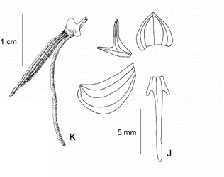 Found in Colombia, Peru, Venezuela and Brazil at elevations of 200 to 260 meters as a medium sized, hot growing terrestrial with an erect stem carrying 7 to 10, oblong-lanceolate to narrowly elliptic, acute leaves clustered towards the middle of the stem that blooms in the fall on a terminal, erect, to 5.2" [13 cm] long,loosely to 15 flowered inflorscence with shorter than the ovary floral bracts.