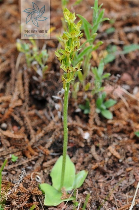 Found in southwestern Sichuan and northwestern Yunnan provinces of China in forests or shrubby grasslands at elevations of 2200 to 3600 meters as a small sized, cold growing terrestrial with an oblong tuber giving rise to an erect, terete, densely papillate, hairy stem carrying 2, basal, nearly opposite, spreading horizontally, sometimes tinged with yellowish white, ovate to broadly elliptic, slighly fleshy, 5 nerved, obtuse rounded basally, acuminate to acute apically leaves that blooms in the summer on an erect, papillate, to 2.8" [7 cm] long, 3 to 7 flowered inflorescence with lanceolate, acuminate floral bracts.
