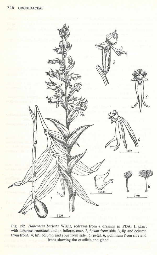 Found in southern India and Sri Lanka in submontane forests in shade at elevations of 1000 to 1220 meters as a small to medium sized, cool growing terrestrial with oblong to pyriform tubers giving rise to an erect stem carrying lanceolate, acute, 5 to 7 nerved, grading smaller and more conduplicate above, basally clasping leaves that blooms in the summer on an erect, terminal, 3.2" [8 cm] long, laxly many flowered inflorescence with lanceolate, acuminate, as long as the flowers floral bracts.