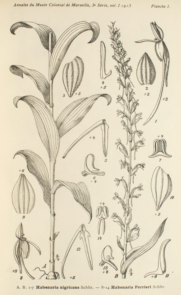 References W3 Tropicos, Kew Monocot list , IPNI ; Repert. Specierum Nova. Regni Vegetabilis Band 33 Schlechter 1925 as H nigricans; Repert. Specierum Nova. Regni Vegetabilis Band 33 Schlechter 1925 as H perrieri; Flora of Madagascar Perrier 1939 as Habenaria nigricans; Flora of Madagascar Perrier 1939 as Habenaria perrieri drawing fide; Flora of Madagascar Perrier 1939; Flora of Tropical East Africa Vol 1 Summerhayes 1968 as H perrier; Orchids of Kenya Stewart & Campbell 1996 as H perrieri; Orchids of Madagascar Du Puy, Hermans, Cribb & Bosser 2007; A Field Guide to the orchids of Madagascar Cribb & Hermans 2009; Les Orchidees de Madagascar Bosser & Lecoufle 2015 photo fide;
