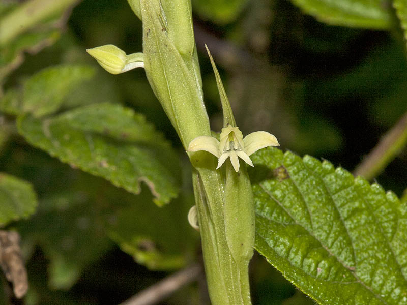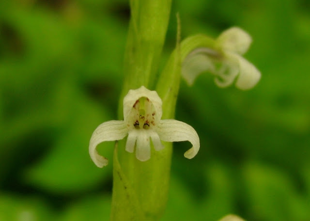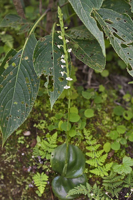 Found in India in semi-evergreen forests along the sedges and open grassy slopes at higher plateaus at elevations of 2000 to 2500 meters as a medium sized [in bloom], cold growing terrestrial with1 to 2, ovate-elliptic to broadlly rounded tubers giving rise to 2, opposite, adpressed to the ground, orbicular-acute leaves that blooms in the summer on an erect, to 9" [to 24.6 cm] long, many flowered inflorescence with basally clasping, triangular, acute, longer than the fragrant flowers floral bracts