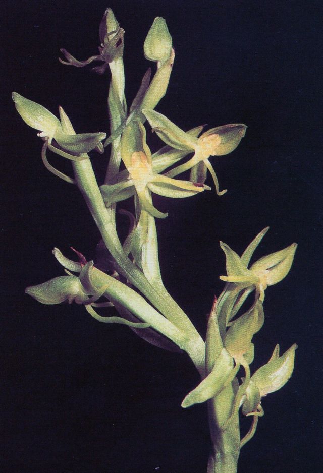 Found in Colombia and Ecuador at elevations of 2000 to 2900 meters as asmall sized, cold growing terrestrial with 2 to 3 just above the base, in a rosette, elliptic to ovate-elliptic, acute to obtus, the uppermost conspicuously smaller, sessile leaves with an erect, remotely sheathed, stem with the sheaths rather loose fitting, that blooms in the spring on an erct, loosely several flowered inflorescence wih ovate-lanceolae, acuminate, as long a to shorter than the ovary floral bracts.