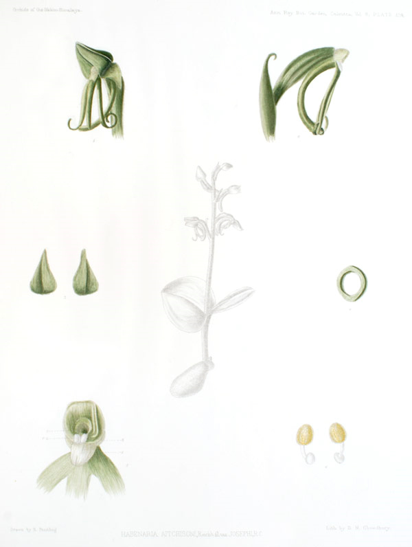 Found in the the Chinese Himalayas, India, Bangladesh, the eastern Himalayas, Nepal, Myanmar, Thailand and the Philippines on open grassy, subalpine slopes at elevations of 3300 to 4900 meters as a mini-miniature to small sized, cold growing terrestrial with ovoid-fusiform tubers giving rise to an erect stem enveloped by a single, basal sheath and carrying from below the middle of the stem, a single, narrowly elliptic-oblong, obtuse to subacute, tapering below into a long, narrow tubular sheath leaves that blooms in the summer, fall and winter on an erect, minutely glandular-pubescent, decurved, .6 to 1.6" [1.5 to 4 cm] long, rather laxly 4 to 6 flowered inflorescence with narrowly lanceolate, acuminate, glandular-pubescent margined, 5 veined, longer than the ovary floral bracts and carrying narrowly campanulate, white flowers.