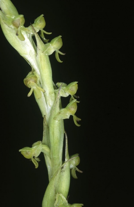 Found in Cameroon, Gulf of Guinea Islands, Zaire, Eritrea, Ethiopia, Sudan, Kenya, Uganda and Yemen in upland grasslands among bracken at elevations of 2000 to 3800 meters as a small to medium sized, cold growing terrestrial with 4 to 7, very unequal, 1 to 2 basal, lanceolate-oblong, grading smaller above to bract-like leaves that blooms in the summer and early fall on an erect, slender, to 6.4" [16 cm] long, rather lax, to 20 flowered inflorescence with longer than the flowers, black apically floral bracts carrying flowers in a single spiral row.