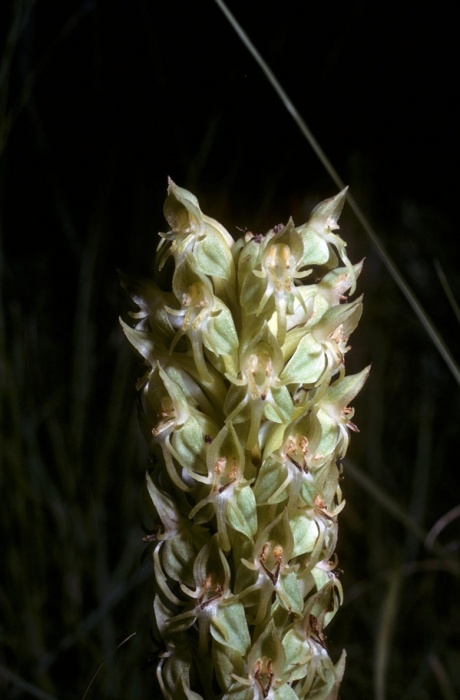 Found in Zaire, Uganda, Angola, Zimbabwe and Cape Province, Lesotho, Natal Orange Free State, Swaziland and Transvaal South Africa in open sunny grasslands at elevations of 1000 to 2000 meters as a small to medium sized, cool growing terrestrial with ellipsoid, tomentose tubers giving rise to an erect leafy stem carrying 2 basal, ovate to reniform, cordate basally, adpressed to the ground becoming bract-like above leaves that blooms in the fall on an erect, 3 to 7.4" [7.5 to 18 cm] long, narrowly cylindrical, densely 20 to 60 flowered inflorescence with longer than the ovaries floral bracts and carrying nocturnally scented flowers