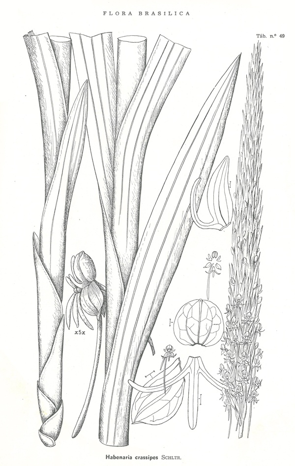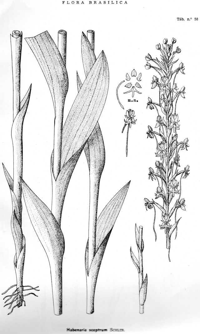References W3 Tropicos, Kew Monocot list , IPNI ; Repert Specierum Novarum Regni Vegetabilis Band 35 Rio Grande Do Sul Schlechter 1925 as H crassipes; Flora Brasilica Vol XII I Hoehne 1940 as H crassipes drawing fide; Orchidaceae Brasilenses Band 1 Pabst and Dungs 1975 as H crassipes drawing good; Orchidaceae Brasilenses Band 1 Pabst and Dungs 1975 drawing fide; Orchidaceae Brasilenses Band 1 Pabst and Dungs 1975 as H sceptrum drawing good; Orquideas de Minas Gerais; El Genero Habenaria Joćo A. N. Batista; Joćo Batista F. da Silva; Luciano de Bem Bianchetti; Rev. bras. Bot. vol.31 no.1 Sćo Paulo Jan./Mar. 2008 photo; The Organ Mountain Range, its History and its Orchids Miller, Warren, Miller & Seehawer 2008 as H crassipes drawing no