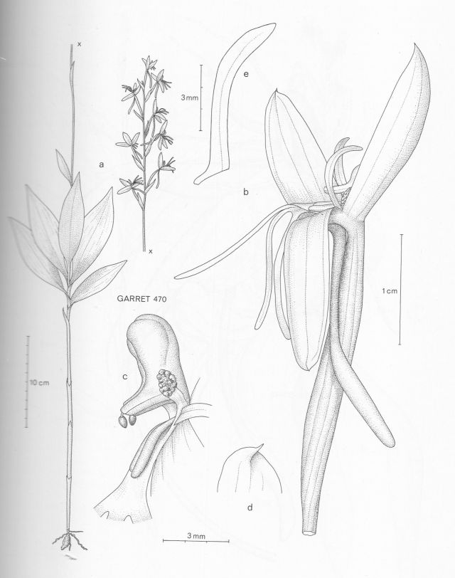 Found in northern Thailand and Vietnam in hill evergreen forests at elevations around 1500 to 1675 meters as a medium to large sized, cool growing terrestrial with an erect, slender stem carrying from the base up, 3 or more leafless clasping sheaths and then 5 to 6, cauline, clustered towards the middle of the stem, elliptic-oblanceolate, acute to acuminate leaves grading above into 1 to 2, erect, lanceolate, sterile bracts that blooms in the late summer and early fall on an erect, terminal, glabrous, 20" to 44" [50 to 90 cm] long overall, rachis from 5.6 to 8.8" [14 to 22 cm] long, lax, to 8 flowered inflorescence with a 5.8 to 8.8" [14.5 to 22 cm] long rachis and lanceolate, acute floral bracts.