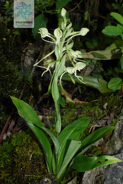 Found in Guangdong, Guangxi and southern Yunnan provinces of China in forests or along valleys in damp locations or on soil covered rocks at elevations of 600 to 2200 meters as a medium sized, warm to cold growing terrestrial with narrowly elliptic, fleshy tubers giving rise to an erect, stout stem with 4 to 5, basal, tufted, oblong-lanceolate to narrowly elliptic, acute contracted and amplexicaule below into the base leaves and several, small bract-like leaves above that blooms in the summer on an erect, 3.2" to 6.4" [8 to 16 cm] long, many flowered inflorescence with ovate-lanceolate, acute to acuminate floral bracts.