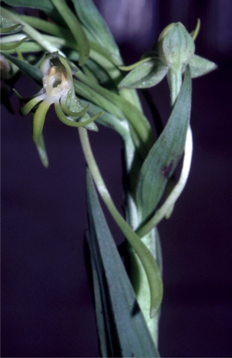Found in Venezuela, Guyana and central Brazil in savannahs at elevations around 300 meters as a small sized, hot growing terrestrial with a short, stout stem enveloped by leaf-bearing sheaths carrying elongate, straight-lanceolate, long acuminate, plicate leaves decreasing in sized above that blooms in the late summer on an erect, 1.2 to 4.8" [3 to 12 cm] long, laxly to subdensely 4 to 10 flowered inflorescence with long-lanceolate, acuminate, shorter than the ovary floral bracts.