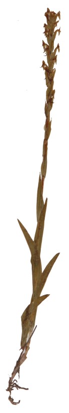 Found in Bahia, Goias, DF, Minas Gerais and Sao Paulo states of Brazil in humid grasslands as a small sized, cool growing terrestrial with an erect stem enveloped by linear, acute, grading larger then smaller above leaves that blooms in the fall and earlier winter on a terminal, erect, 1.2 to 2" [3 to 5 cm] long, many flowered inflorescence with leaf-like, imbricate, ovate-lanceolate, acuminate, as long as the flowers floral bracts.