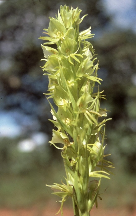 Found in Tanzania and Malawi in long grass at edges of woodlands at elevations of 1800 to 1900 meters as a large sized, cool growing terrestrial with about 10, lower 2 to 3 sheathing, upper 3 bract-like the rest erect, broadly lanceolate, basally clasping leaves that blooms in the early fall on an erect, 4.8 to 7.2" [12 to 18 cm] long, densely many flowered inflorescence with prominent, longer than the flower, lanceolate, acute floral bracts.