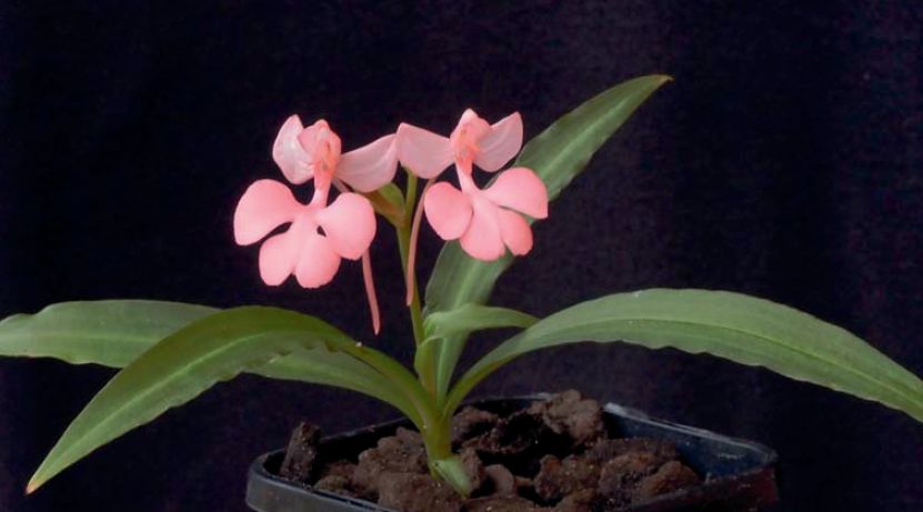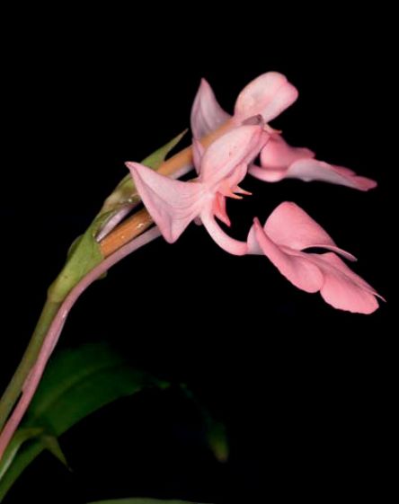 Found in Phitsanulok Province in northern Thailand often growing on moss covered rocky areas surrounding seasonally affected waterways at elevations of 200 to 500 meters as a small to medium sized, hot growing lithophyte with a discoid, fleshy, flattened, duck foot tuber giving rise to an erect, shprt stem carrying 4 to 6, in a rosette, thin, glabrous, sessile, lanceolate, acute-acuminate, 7 veined, keeled, dark green, veins sometimes darker green as to appear lightly tesselated, slightly wavy, thin margin leaves that blooms in the fall on an erect, slender, bilaterally compressed, dark green to reddish tinged, 2" [5 cm] long, 2 to10 flowered inflorescence carrying the resupinate, showy, porrect, non-fragrant flowers mostly held to one side.