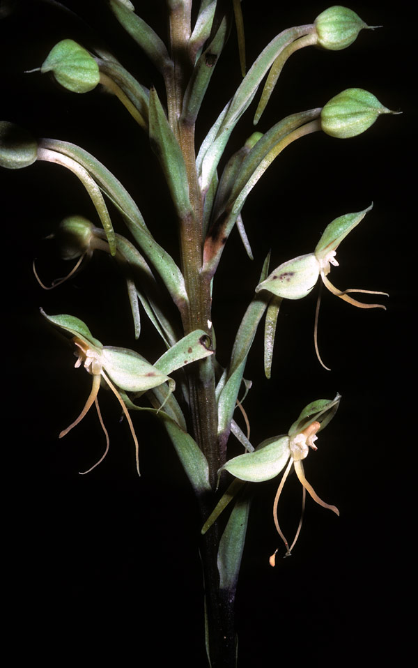 Found in Java and Mt Kinabalu Borneo in montane forests at elevations of 1200 to 1800 meters as a medium to just large sized, cool growing terrestrial orchid with dark stems carrying 7 to 9, well spaced, high above the ground, lanceolate, long acute, pale green, darker veined leaves that blooms in the spring on a terminal, erect, densely to 40 flowered inflorescence with unpleasantly scented flowers