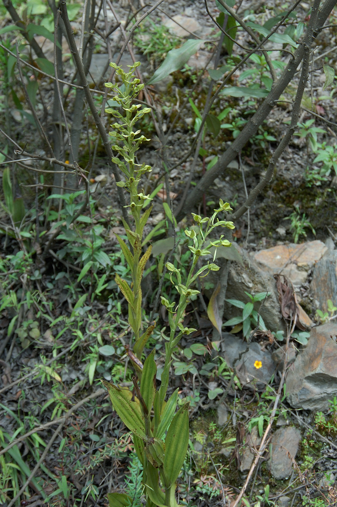 Found in Peru at elevations of 1500 to 2500 meters as a large sized, cool to cold growing terrestrial with a stout stem carrying all along, oblong-lanceolate to lanceolate-elliptic, acute or shortly acuminate, ascending, more or less imbricating leaves that blooms in the spring on an erect, terminal, thick, densely many flowered, to 9.2" [22.7cm] long, several flowered inflorescence
